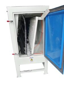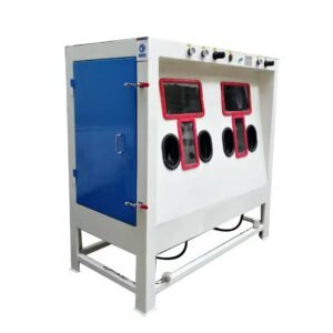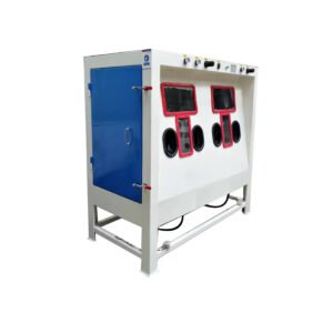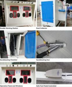 1. The tombstone blasting cabinet has double working stations, containing 2 sets blasting gloves and 2 sets blasting guns, which allows bigger size workpieces, and two operates working simultaneously. 2. The inner cabinet of the stone blasting machine has back pulleys and bottom slide for easy movement of the products, ensures the surface of the workpiece is uniformly blasted by abrasives, achieve optimal sandblasting results. 3. When the foot switch is lightly pressed, the solenoid valve opens and the compressed air enters the blast gun. The abrasive will be ejected from the bottom of the storage tank to the gun, then is jetted onto the surface of the workparts. 4. Adjusts the filter pressure valve to control the compressed air pressure which enters into the blasting gun based on the working requirements. The working pressure can be chosen within the range of 2.8-7 bar. 5. The dust collector at the back of the headstone sandblasting cabinet is cartridge filter type, effectively remove dust from the working chamber.