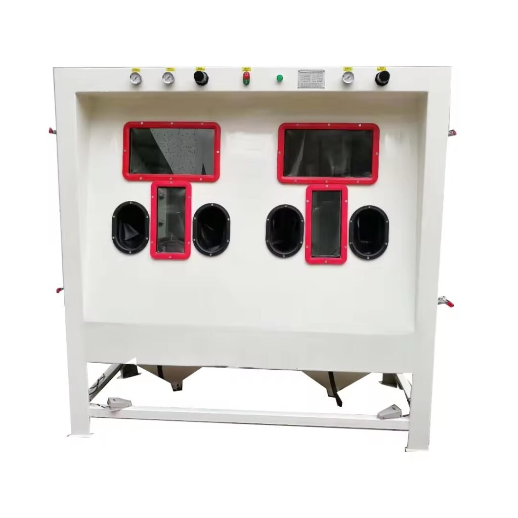 1. The tombstone blasting cabinet has double working stations, containing 2 sets blasting gloves and 2 sets blasting guns, which allows bigger size workpieces, and two operates working simultaneously. 2. The inner cabinet of the stone blasting machine has back pulleys and bottom slide for easy movement of the products, ensures the surface of the workpiece is uniformly blasted by abrasives, achieve optimal sandblasting results. 3. When the foot switch is lightly pressed, the solenoid valve opens and the compressed air enters the blast gun. The abrasive will be ejected from the bottom of the storage tank to the gun, then is jetted onto the surface of the workparts. 4. Adjusts the filter pressure valve to control the compressed air pressure which enters into the blasting gun based on the working requirements. The working pressure can be chosen within the range of 2.8-7 bar. 5. The dust collector at the back of the headstone sandblasting cabinet is cartridge filter type, effectively remove dust from the working chamber.