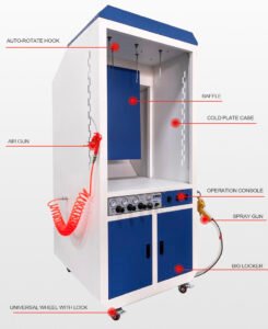 The body of the powder spray booth/Fan motor/Filter/360 autorotation Hangers/ spare parts.