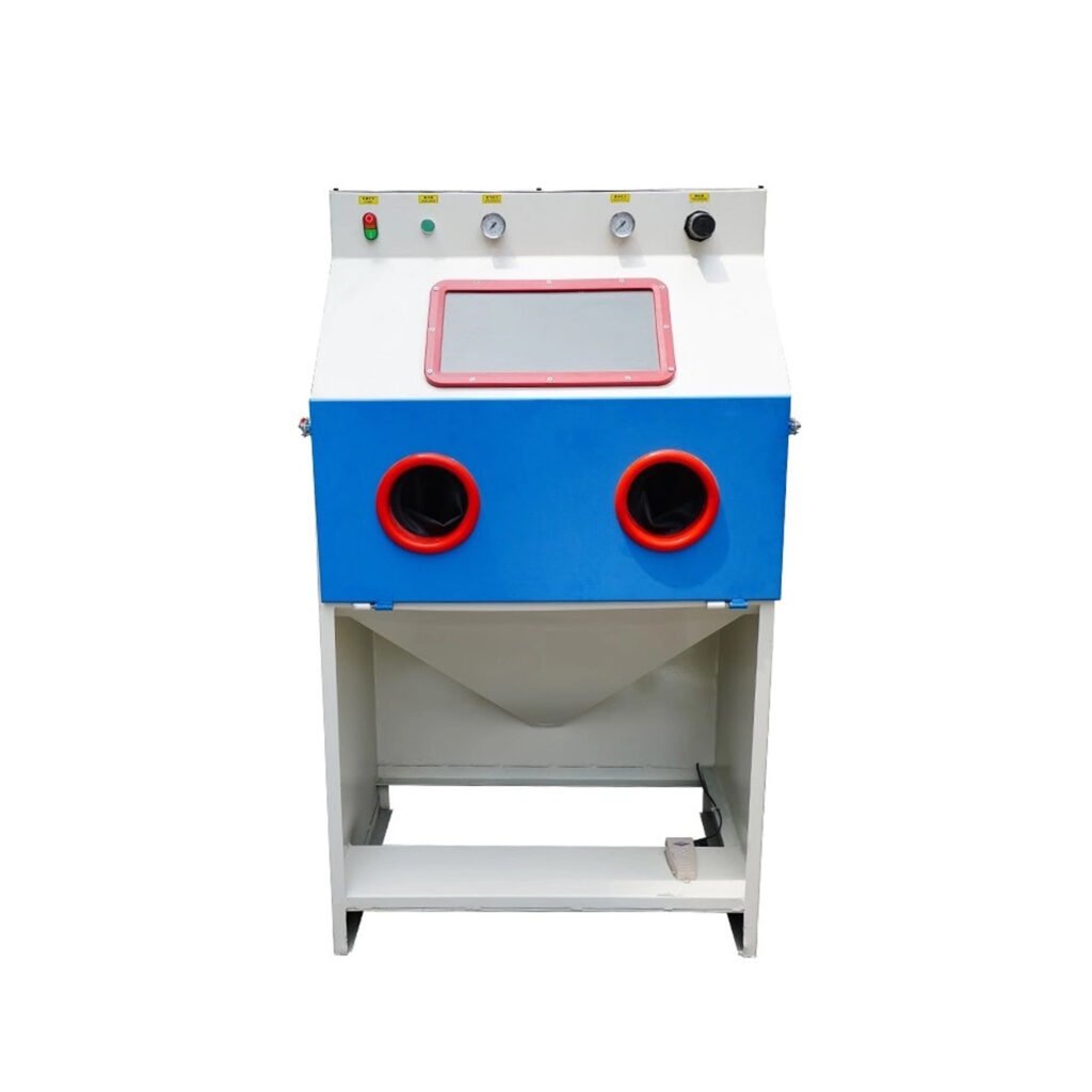 The small blast cabinet is a suction type blaster, which works by an air jet sucks the media up to the blast gun and the media is mixed in just before it exits through the nozzle. Though this method is not powerful as pressurized blasting, it meets most basic application but requires less budget and less maintenance.